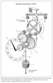 Inventée entre 1200 et 1300 de notre ère, l’horloge mécanique à foliot entraîne une transformation qualitative du concept de temps qui cesse d’être celui du gnomon, du cadran solaire, de la clepsydre et du sablier. Le gnomon dont l’origine remonte aux débuts de l’agriculture est un simple bâton planté dans le sol. En mesurant la longueur de l’ombre projetée par l’objet au cours de la journée, on peut étudier les mouvements apparents du soleil et en déduire les différents moments du jour. L’instrument postérieur au gnomon est le cadran solaire que l’on voit encore aujourd’hui sur les façades de quelques bâtiments. Inventé par les Mésopotamiens, il se compose d’un style et d’une base plane, sphérique ou cylindrique sur laquelle sont tracées des lignes marquant les subdivisions de la journée. Selon son degré de perfectionnement, le cadran solaire peut être un instrument très précis, il a le défaut cependant de ne pas fonctionner la nuit ou lorsque le ciel est couvert. Pour remédier à cet inconvénient, les Égyptiens inventent la clepsydre. Son nom vient du grec klepsydra, et servait à limiter le temps de parole des avocats lors des procès. C’est un instrument qui mesure le temps par l’écoulement d’une certaine quantité d’eau d’un récipient gradué dans un autre. L’avantage de la clepsydre est de s’affranchir du soleil, mais son inconvénient est de ne pas fonctionner pendant les hivers rigoureux des régions septentrionales, car l’eau gèle. Il faut donc inventer un nouvel instrument pour pallier ces faiblesses : ce sera le sablier. Il n’apparaît en Gaule qu’au 7e siècle, car sa fabrication exige tout le savoir-faire des maîtres verriers. L’écoulement du sable est en effet compromis s’il n’est pas protégé de l’humidité. Le sablier nécessite, en outre, d’être retourné plusieurs fois par jour. Il convient donc d’inventer un instrument fonctionnant de jour comme de nuit, qui ne gèle pas en hiver et qui ne réclame qu’un minimum de surveillance. Or, après avoir découvert avec le gnomon et le cadran solaire qu’on pouvait interpréter le déplacement du soleil dans l’espace comme une manifestation du temps, on s’est rendu compte que son écoulement traduit par un flux d’eau ou de sable pouvait être fractionné. Aussi, l’idée de partager le temps grâce à l’adoption d’un rythme régulier s’est peu à peu imposée avec la première horloge à foliot, à la fin du 13e siècle (1). Désormais, la mesure du temps ne dépend plus des éléments naturels ; c’est un temps mécanique, divisible en unités successives. L’invention de l’horloge à foliot est un événement historique d’une portée considérable, parce qu’il introduit la notion, pour le temps, de rythme séquentiel régulier. Il s’agit d’une révolution profonde, car cette invention exploite la force de gravité, en l’utilisant pour la première fois comme moteur et régulateur du système. Considérons le principe de fonctionnement de la première horloge mécanique à foliot : la chute d’un poids, relié par une corde à une poulie comportant un encliquetage, entraîne la rotation d’une roue verticale nommée roue de rencontre, dont le mouvement est régulé par un système dit d’échappement ; il en résulte des impulsions transmises à un train de rouages qui coordonne la rotation périodique d’une aiguille qui indique l’heure sur un cadran gradué. On pourrait croire que l’horloge mécanique n’est rien d’autre que la forme perfectionnée des clepsydres et des sabliers où la pesanteur sert aussi à mesurer le cours du temps, par écoulement de l’eau ou par glissement de sable ; mais il n’en est rien. La vitesse de chute du poids d’une horloge mécanique produit une accélération qui oblige les rouages à tourner de plus en plus vite et empêche le mouvement périodique du cadran. La solution consiste ici à cadencer et réguler, par un système alternatif de blocage-déblocage (nommé système d’échappement), le mouvement de la roue de rencontre et, à travers elle, la rotation du tambour et le dévidage de la corde qui retient le poids, afin qu’il s’effectue périodiquement. À cette fin, la roue de rencontre est munie de dents courbées qui agissent sur les palettes, elles-mêmes assujetties à une tige verticale appelée verge, sur laquelle est fixée une barre horizontale, le foliot. L’impulsion transmise par la roue de rencontre sur l’une des palettes de la verge initie le mouvement d’oscillation du foliot qui par retour grâce à l’inertie de ses régules – petits poids déplaçables fixés à ses extrémités – libère la roue de rencontre. Celle-ci, entraînée à nouveau par la chute du poids relâché, fournit alors une nouvelle impulsion sur l’autre palette, et ainsi de suite. Le mouvement cadencé qui en résulte est transmis par le train de rouages à l’aiguille selon un mouvement périodique (2).